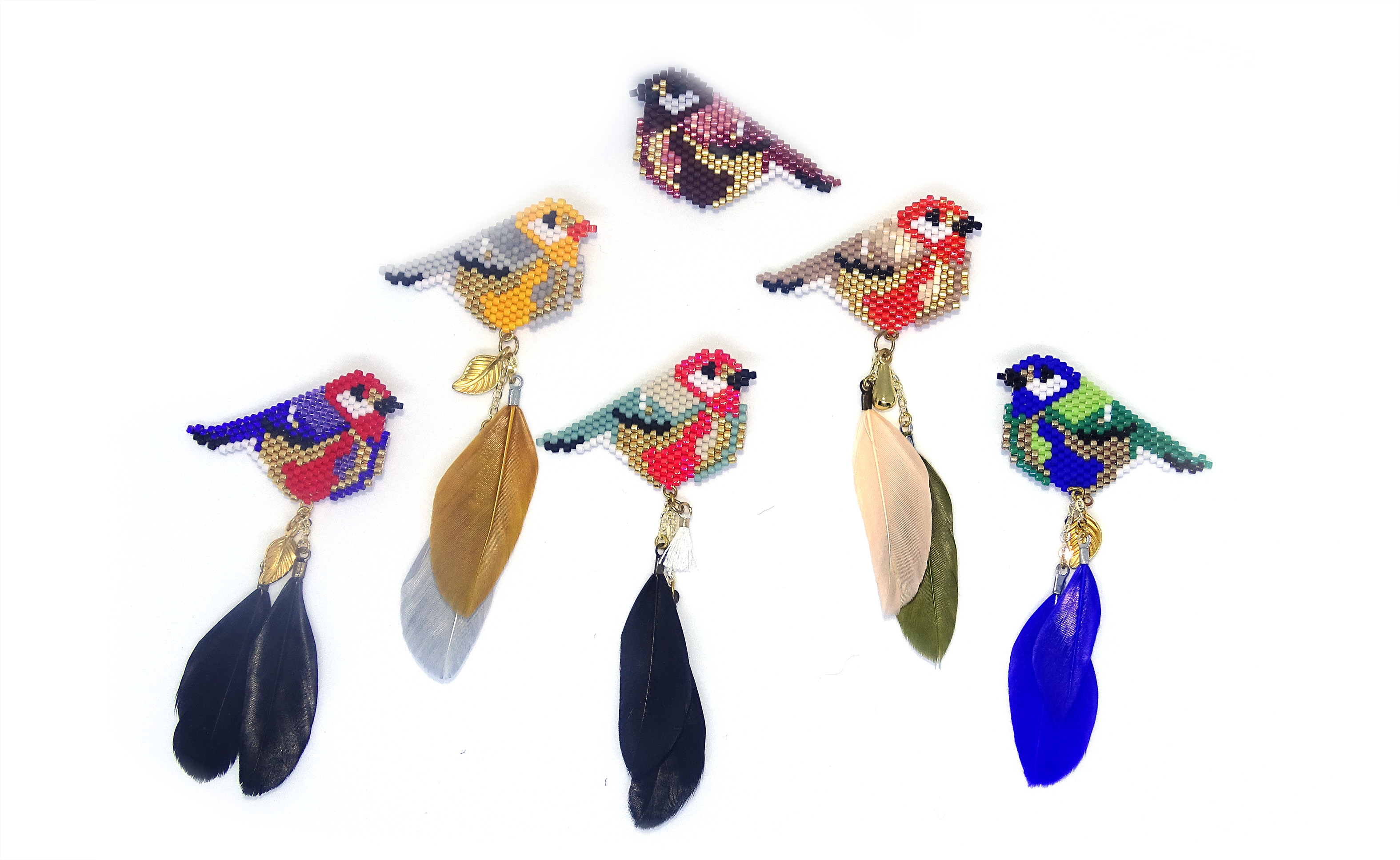 Broches PIAF en tissage de perles, breloques et plumes – 12€ et 15€ selon la taille